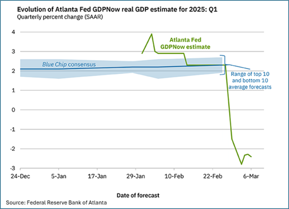 On another note, the Atlanta Fed GDPNow graph, which is making the rounds, looks very disinflationary as GDP growth goes below 0%. It is noted that this view is not shared. The GDPNow model estimate for real GDP growth (seasonally adjusted annual rate) in the first quarter of 2025 is -2.4% on March 6, down from -1.5% on February 28, and certainly not inflationary, if the estimate is correct.
